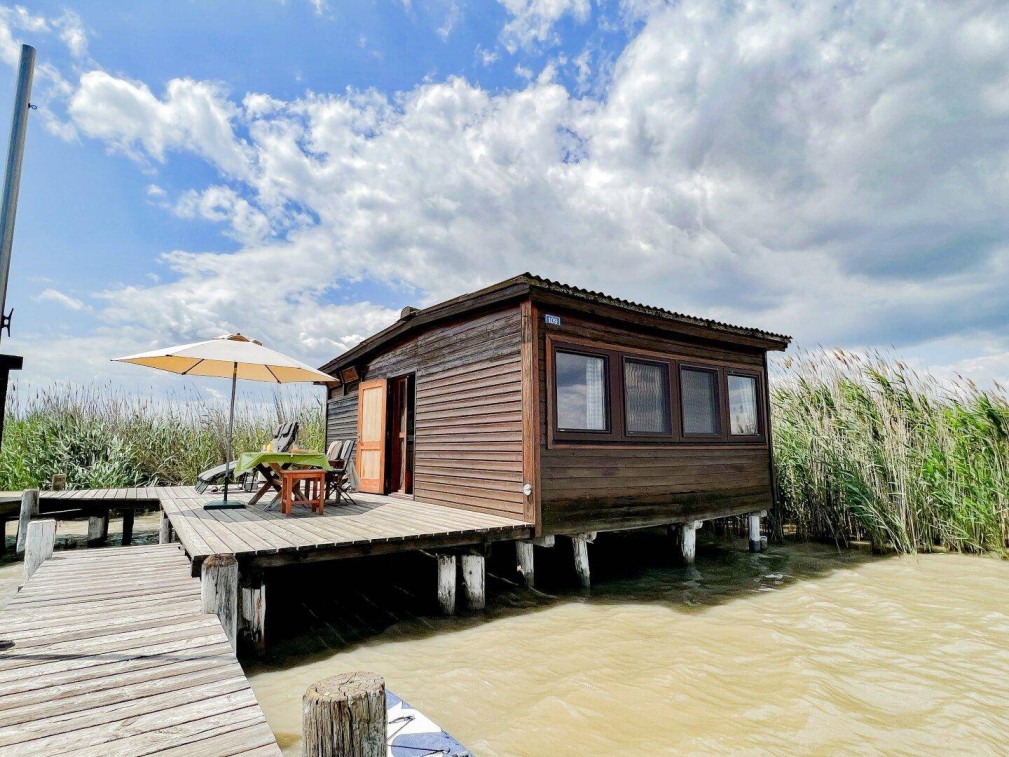 • ein Surfbrett.Die Hütten weisen insgesamt eine Wohnfläche von ca. 48 m2 auf, die Plateaus bieten auf ca. 32 m2, die Stege ca. 13 m2 Platz.Die Hütte ist einfach ausgestattet und weist leichten Renovierungsbedarf auf. Die Piloten (Steher, auf der die Hütte stehen) wurden immer wieder erneuert.Die Ruheoase im See ist mit einer Photovoltaik-Anlage mit Solarzellen - die auf dem Bootshaus angebracht sind - ausgestattet. Die gewonnene Energie wird mittels zwei Batterien gespeichert. Es steht ein 12-Volt- Stromnetz zur Verfügung.Im Preis der Hütte ist das Elektroboot inkludiert.Mit Wasser können Sie sich über einen Wassertank versorgen, das mit dem Boot von einer Wasserentnahmestelle im Hafen geholt werden kann.Die Hütte ist nur zur Nutzung in der Sommersaison ausgelegt.