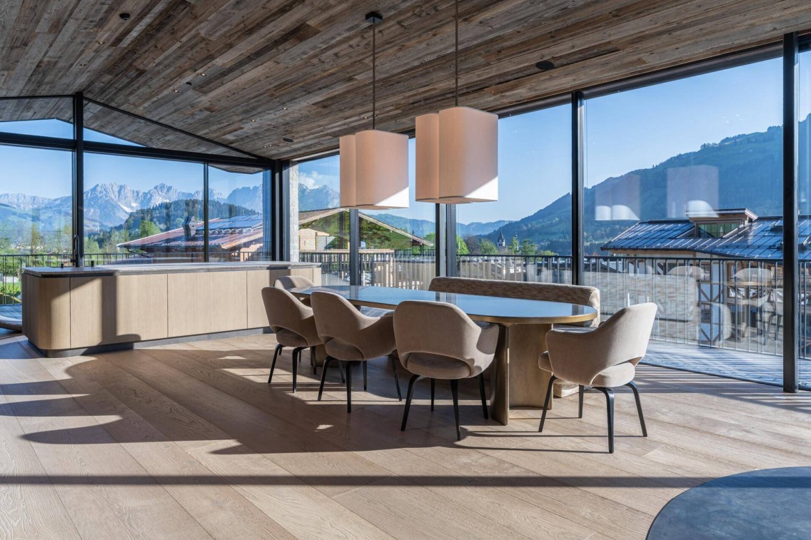 Diese erstklassige Villa befindet sich direkt an der begehrten Hahnenkammstraße in Kitzbühel mit Blick auf den Zielhang der weltberühmten „Streif“ und ist nur einen Katzensprung vom charmanten Stadtzentrum entfernt. Die Immobilie vereint alpine Eleganz mit modernstem Wohnkomfort und lässt keine Wünsche offen. Dachgeschoss: ein offener Wohn- und Essbereich mit imposanten Fensterfronten, die atemberaubende Ausblicke auf das Kitzbüheler Horn und den Wilden Kaiser eröffnen. Ein schwebender Design-Kaminofen des Typs „Gyrofocus“ schafft eine warme, stilvolle Atmosphäre. Von den großzügig gestalteten Terrassen genießen Sie ungestörte Sonnenstunden und spektakuläre Panoramen. Erdgeschoss: Hier empfängt Sie ein großzügiger Eingangsbereich, der in die stilvoll gestalteten Schlafzimmer mit jeweils eigenen Bädern führt. Jedes Detail wurde mit Blick auf Komfort, Funktionalität und Ästhetik realisiert. Untergeschoss: Die hauseigene Wellnessoase mit Indoor Pool, Sauna, Whirlpool-Terrasse, Innenhof sowie stilvoller Liegelounge und eigenem Badezimmer schafft eine private Rückzugsoase der Extraklasse. Der modern ausgestattete Fitnessraum mit Geräten von „North“ bietet beste Voraussetzungen für Ihr tägliches Workout.
