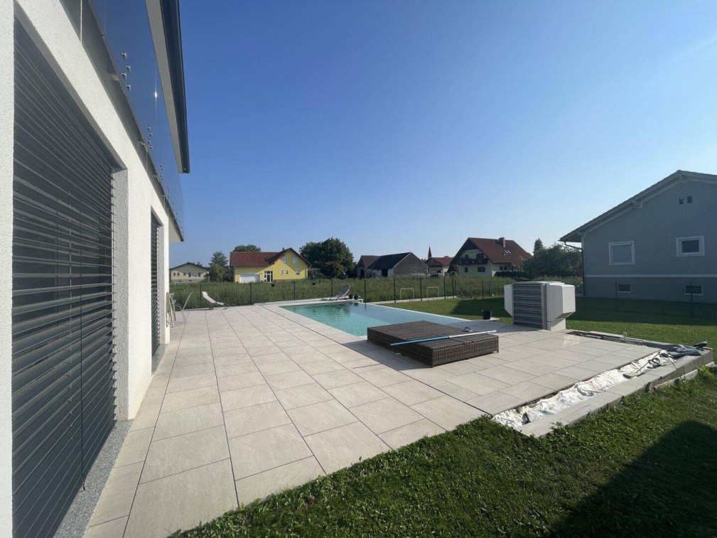 Die ca. 245 m² Nutzfläche verteilt sich auf zwei Ebenen. Durch das überdachte Eingangsportal gelangen Sie in den Innenbereich der Immobilie. Im Erdgeschoss erwartet Sie ein offen gestalteter Eingangsbereich, ein Badzimmer mit WC, ein Wohn- und Essbereich mit einer räumlich abgetrennten Küche, eine Speis und ein Technikraum (Abstellraum). Ein separater Zugang von der Doppelgarage in den Vorraum ermöglich eine praktische Nutzung. Die sonnige, große Terrasse mit Pool und der herrliche Garten bietet den idealen Rahmen für entspannte Stunden im Freien.