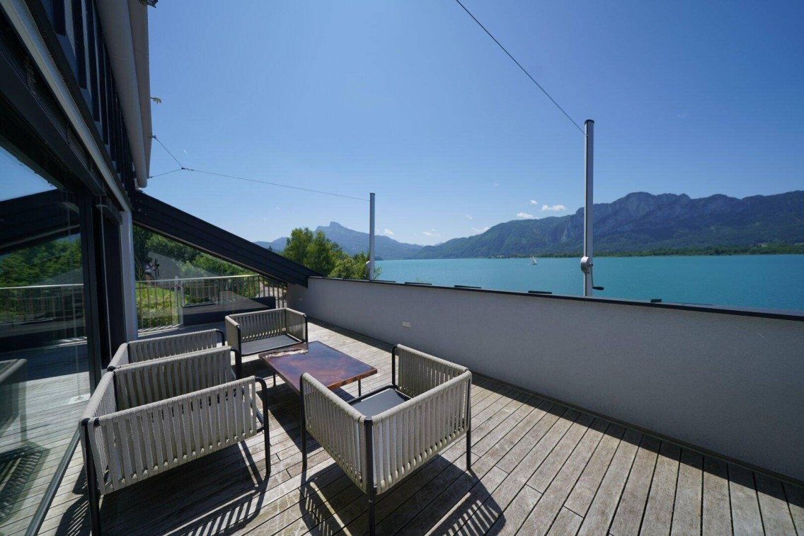 Die Entwicklung des Mondseelandes ist nicht nur geschichtlich eng mit der Stadt Salzburg verbunden, sondern auch verkehrstechnisch durch die A1 West Autobahn, über die die Region schnell zu erreichen ist. Nur ~5 Fahrminuten von der Autobahnanschluss-Stelle Mondsee entfernt, steht ein modernes Penthouse am See zum Verkauf.Das exklusive Penthouse mit eigenem Liftzugang bietet nicht nur eine erstklassige Ausstattung, sondern auch einen eigenen Badeplatz mit Steg und Bootsliegeplatz (auf Eigengrund). Die Wohnung ist unterteilt in ein großzügiges Wohn-/Esszimmer mit offener Küche sowie in ein Schlafzimmer mit en-suite Bad. Große Fensterfronten und bodentiefe Glasschiebetüren mit Zugang auf die ~37m² große Terrasse eröffnen einen wunderbaren Blick auf den Mondsee und die Drachenwand. Bei der Innenausstattung wurden höchste Ansprüche sowohl an die Qualität der Materialien als auch ihre Funktionalität gestellt. Die Beheizung und Warmwasseraufbereitung erfolgt mittels Wasser-Wärmepumpe, für die Wasserversorgung steht eine private Quelle zur Verfügung.Die Wohnung wird vollständig möbliert inkl. zweier Garagenplätze samt Bootsliegeplatz (ausschließliches Nutzungsrecht) zum Verkauf angeboten.Mondsee bietet mit einer vielseitig ausgebauten Infrastruktur (Schulen, Einkaufsmöglichkeiten , ... ) sowie Kultur und Sehenswürdigkeiten die idealen Voraussetzungen für ein Leben in der Natur mit guter Zentralität.Objekttyp:WohnungseigentumWohnungsgröße:~102,3 m² (lt. NWGA)Heizung/Warmwasser:Wasser-WärmepumpeBesondere Ausstattungsmerkmale:Alu-FensterBarrierefreier Wohnungszugang (Lift)FußbodenheizungEichendielenbodenEinbau SchränkeKaminanschlussKlimaanlageLichtdesignLoxoneMarkenkücheRaffstore mit WindwächterWohnraumlüftung...Parkmöglichkeit:EinzelgarageZusätzlich besteht die Möglichkeit zum Ankauf eines Carport-StellplatzesSonstiges:Die Gemeinde Tiefgraben ist eine Vorbehaltsgemeinde im Sinne des OÖ. Grundverkehrsgesetzes. Eigentümer oder Mieter sind verpflichtet einen Hauptwohnsitz anzumelden.Finanzierung und Versicherung:Unsere Kolleginnen und Kollegen der Raiffeisenbank Attersee-Süd stehen Ihnen für ein unverbindliches Beratungsgespräch sehr gerne zur Verfügung.Allgemeines:Unverbindliches, freibleibendes Angebot. Die Angaben erfolgen aufgrund von Informationen und Unterlagen vom Eigentümer und/oder von Dritten und sind ohne Gewähr. Irrtümer und Änderungen vorbehalten. Noch nichts gefunden? Wir informieren Sie zeitnah über geeignete Immobilienangebote.