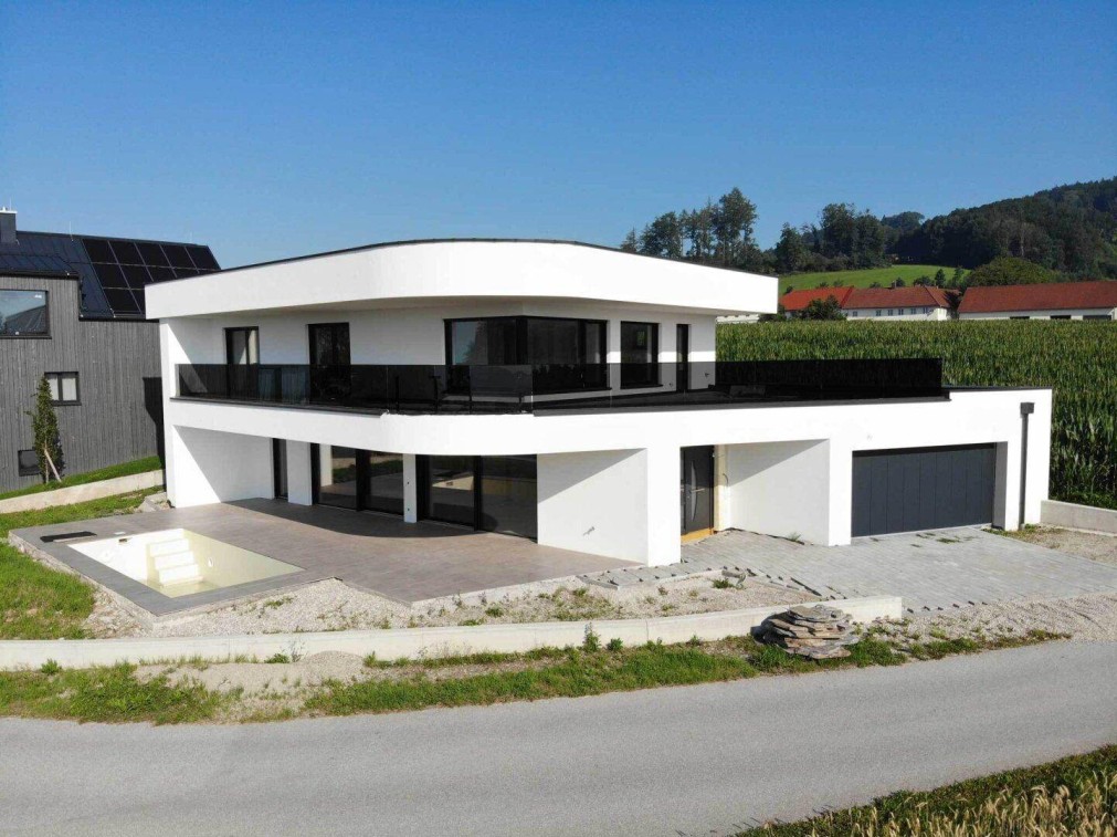 Zum Verkauf gelangt ein Wohnhaus, welches ca. 80% fertig errichtet wurde. Das Haus kann übernommen werden, wie es liegt und steht oder wir übergeben das Haus schlüsselfertig an den neuen Eigentümer. Die Fertigstellung erfolgt in enger Abstimmung mit dem Käufer und dieser kann noch gerne seine Wünsche betreff Fliesen, Parkett, Gestaltung einbringen. Wir übergeben dann Haus mit fertiger Aussenanlage, Zaun, Pool, Bäder verfliest und fertig ausgestattet, Heizung und Haustechnik, Innentüren, Fussboden ( hochwertiger Parkett ) fertiggestellt.Insgesamt belaufen sich die Fertigstellungsarbeiten auf rund € 300.000,--, welche vom Verkäufer getragen werden.Das Haus zeichnet sich durch die offene lichtdurchflutete Architektur und Großzügigkeit aus. Der neue Eigentümer hat die Möglichkeit noch eigene individuelle Wünsche einfließen zu lassen.Ausstattungshighlights:• Pool• Außenliegender Sonnenschutz• Garage für 2 Autos• große Terrassen• Fussbodenheizung mit Luftwärmepumpe• Loxone Bussystem• Große bodenebene Schiebefenster im Erdgeschoss zur Terrasse• LED Beleuchtung auf der Terrasse• Schöne Gartenanlage• Elektrischer Anschluss für eine Sauna auf der Terrasse vor dem ElternschlafzimmerWir weisen darauf hin, dass zwischen dem Vermittler und dem zu vermittelnden Dritten ein familiäres oder wirtschaftliches Naheverhältnis besteht.