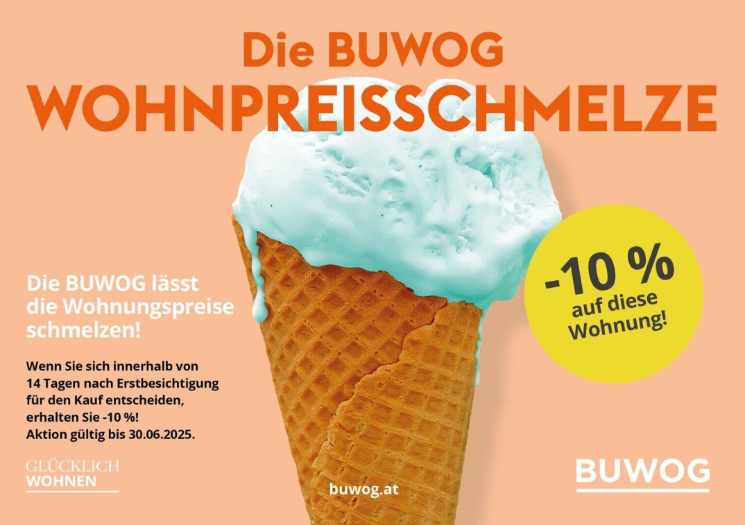 Aktion lediglich gültig für einzelne, im Rahmen der Bewerbung auf Immobilienplattformen entsprechend gekennzeichnete gebrauchte Wohnungen (Bestandswohnungen). Die Aktion ist gültig ab 01.06.2025 bei Einlangen eines verbindlichen Kaufanbots binnen 14 Tagen ab Erstbesichtigung aber bis längstens 30.06.2025 und vorbehaltlich einer Annahme durch die jeweilige BUWOG Verkäufergesellschaft. Erfolgte die Erstbesichtigung bereits zwischen dem 17.05.2025 und dem 31.05.2025 beginnt die Frist von 14 Tagen erst ab dem 01.06.2025 zu laufen. Nicht mit anderen Rabattaktionen oder Vergünstigungen kombinierbar. Nur gültig auf Wohnungen, nicht aber Stellplätze.Vorbehaltlich Änderungen und Irrtümer. Die Wohnung wird im Zustand "unsaniert" ohne Gewährleistung verkauft. Aufgrund des Rückzahlungsbegünstigungsgesetzes (RBG) 1987 unterliegt die Wohnung bei Vermietung der angemessenen Mietzinsbildung. Der Kaufpreis versteht sich als Fixpreis.