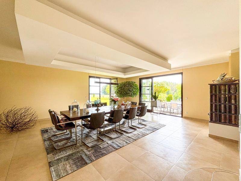 Eingebettet in ein über 7.000 m² großes Grundstück am Waldrand, eröffnet sich hier ein Ort der Ruhe – ein privates Refugium für Menschen mit Sinn für Ästhetik, Natur und Großzügigkeit. Ursprünglich als Mostschenke konzipiert, ist der Geist der Gastlichkeit bis heute spürbar. Was einst Begegnungsort war, ist heute ein stilvolles Zuhause – offen, einladend und bereit, neu belebt zu werden. Bereits die Zufahrt – bewusst naturbelassen – bereitet auf das Besondere vor. Im Eingangsbereich: ein großzügiges Vorzimmer mit direktem Zugang zur Gartenanlage im Westen. Herzstück des Hauses ist das lichtdurchflutete Atrium mit rund 80 m² Wohnfläche und bis zu ca. 5,7 m Raumhöhe. Der raumprägende Kamin aus der Ofenmanufaktur Uwe Seidl (25 kW) inszeniert den Raum als architektonisches Statement. Ein schwebender Laufsteg verbindet die Ebenen und unterstreicht das Gefühl von Weite und Leichtigkeit. Im Anschluss öffnet sich der Wohn- und Küchenbereich mit Speiseraum…auf fast 90 m² elegant zoniert, lichtdurchflutet und mit direktem Zugang zur Terrasse. Die Materialien: hochwertig, stimmig, mit Blick fürs Detail. Im Erdgeschoss befindet sich außerdem eine separate Gästeeinheit mit rund 50 m² und herrlichem Ausblick - ideal für Besucher oder zur separaten Nutzung. Im Obergeschoss setzen sich Raumgefühl und Groß-zügigkeit fort: ein rund 62 m² großes Büro sowie der Masterbereich mit über 80 m², zwei Schrankräumen, Schlafzimmer mit walk´in Dusche und WC sowie Balkon mit grandiosem Fernblick. Das separate Masterbad im Südflügel – über 60 m² – wartet auf individuelle Gestaltung. Das Tiefparterre erstreckt sich über ca. 300 m². Hier ist alles vorbereitet für einen privaten Spa-Bereich: Sauna, Duschen, Tauchbecken – und ein großzügiges Indoor-Pool mit Zugang in den Garten.