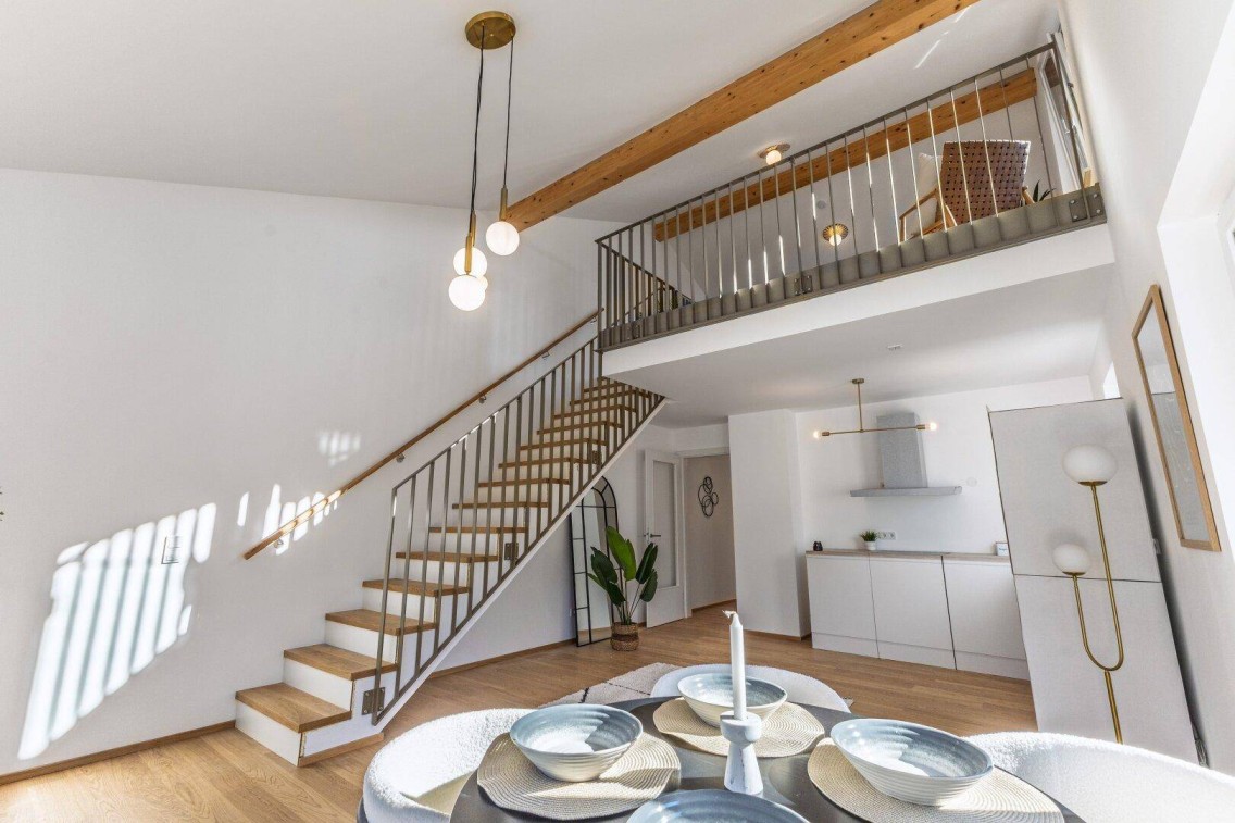 Das Highlight dieser 3,5-Zimmer Galeriewohnung ist die Möglichkeit, den Wohnbereich auf zwei Ebenen zu gestalten. Der ca. 30 m² große Koch- und Essbereich bietet viel Platz für die ganze Familie und darüber hinaus Zugang zu einem von zwei Balkonen. Die ca. 20 m² große und dank bodentiefer Fenster sehr helle Galerie erweitert den Wohnbereich zusätzlich in das Dachgeschoss und gewährt mit angrenzendem Dachboden wertvollen Stauraum. Die Möglichkeit für eine hohe Wohnbauförderung runden das Angebot dieser einzigartigen Wohnung ab.