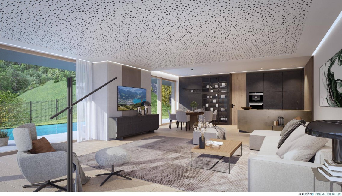 Großzügige, elegante 2-Zimmerwohnung. Schlafzimmer, Bad und Ankleidezimmer en Suite mit spektakulärer 182 m² großer Terrasse. Derzeit ist ein Whirlpool geplant. Kann auf Käuferwunsch auch ein Pool geplant werden (sep. Kosten).