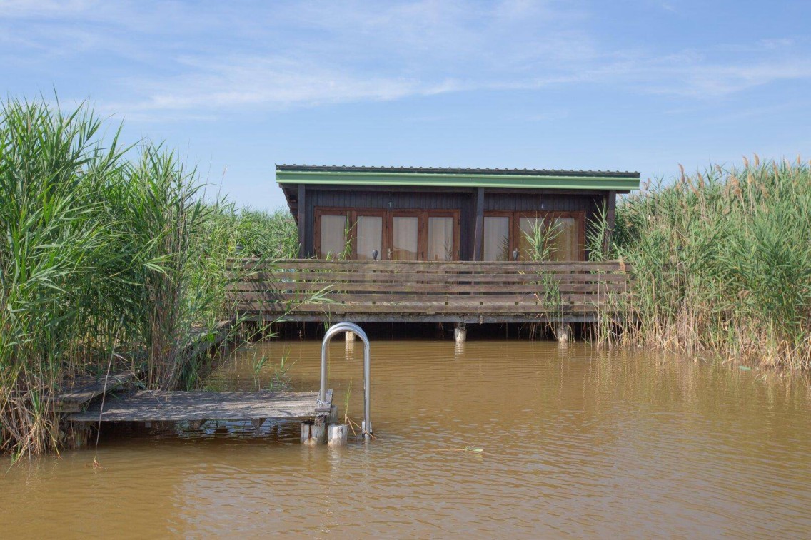 Diese von einem dichten Schilfgürtel von den Nachbarhütten abgegrenzte Flachdach-Seehütte liegt im hinteren Drittel der Südbucht in herrlich ruhiger Lage (kein Linienschiffsverkehr). Sie erreichen die Seehütte mit dem E-Boot in weniger als 7 Minuten vom Ruster Südhafen.ANSCHLÜSSE: