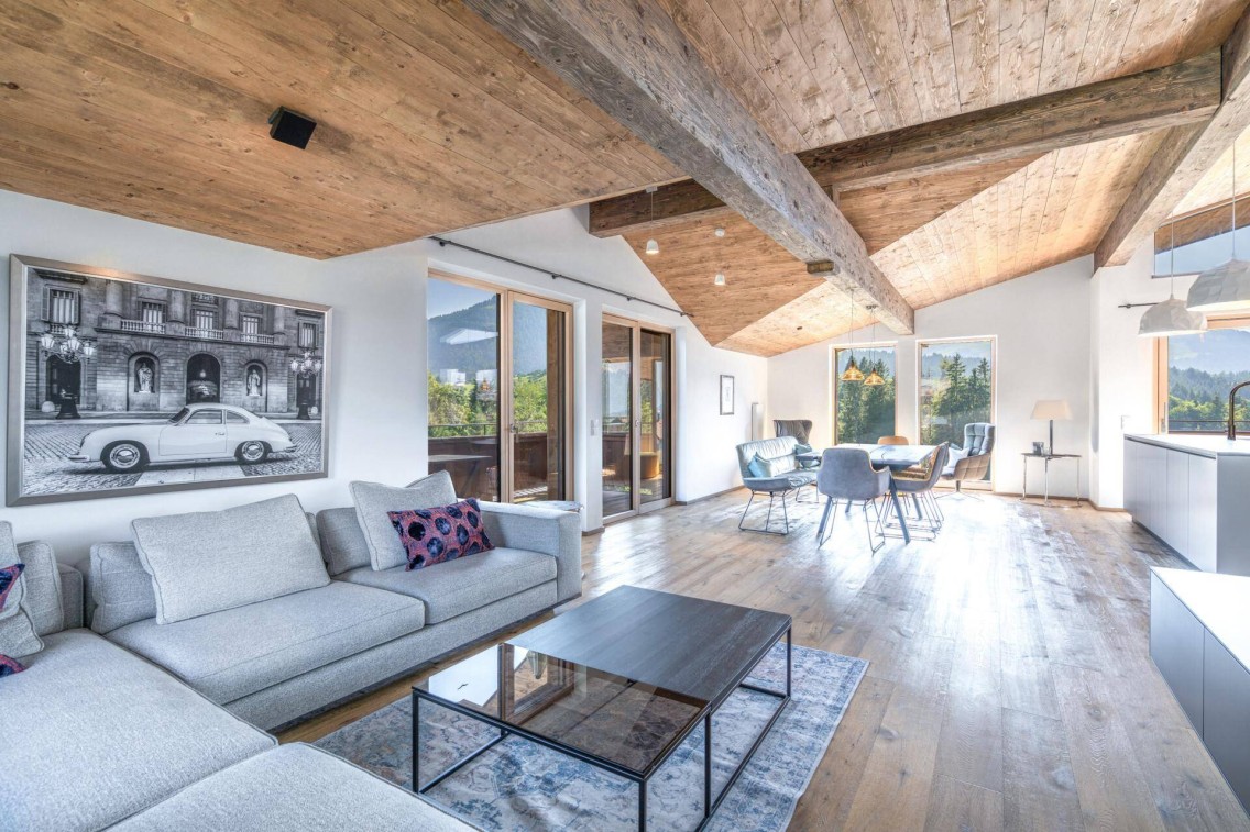 Das gesamte Penthouse wird von einem Sichtdachstuhl aus gehackter Eiche geprägt, der eine warme und stilvolle Atmosphäre schafft. Der großzügige offene Wohn- und Essbereich geht fließend in die drei Balkone über, die den Blick auf die spektakuläre Bergwelt freigeben: