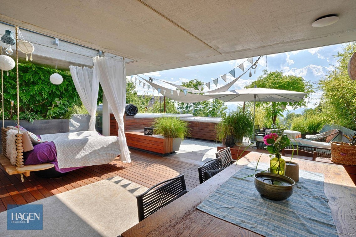 Herzstück der Immobilie ist die großzügige, teils überdachte Terrasse mit einem eleganten Pool sowie einem Whirlpool – von hier aus eröffnet sich ein nahtloser Übergang in die idyllisch gestaltete Gartenfläche. Der freie Blick ins Grüne und die umliegende Hügellandschaft lässt Architektur und Natur zu einer Einheit verschmelzen.