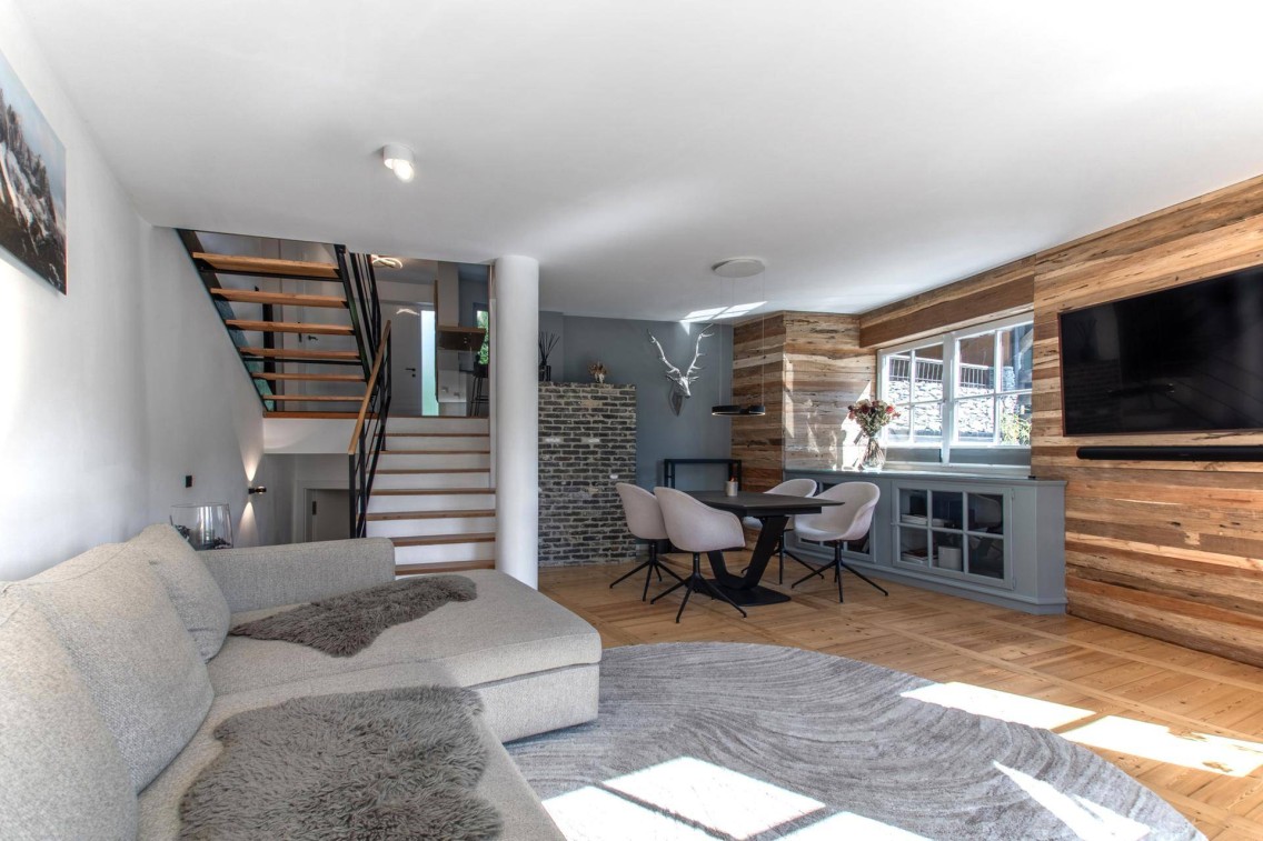 Ein privater Fitnessbereich lädt zu sportlichen Aktivitäten ein und der angrenzende Wellnessbereich mit Sauna bietet perfekte Entspannung nach einem aktiven Tag in den Bergen. Die lichtdurchfluteten Wohnbereiche und das offene Raumkonzept verleihen dem Haus eine freundliche und einladende Atomsphäre.