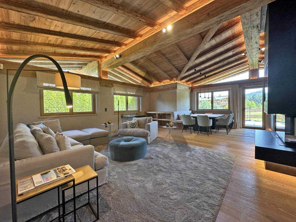 Im traditionellen Tiroler Landhausstil jedoch mit modernster und hochwertigster Ausstattung entstand diese Chalet-Einheit in einem traumhaften Ensemble mit sechs Einheiten in ruhiger und leicht erhöhter Ausblicklage von Kirchberg in Tirol. Diese Einheit bietet einen besonders schönen Blick auf die Fleckalm, Maierl und das Kitzbüheler Horn.