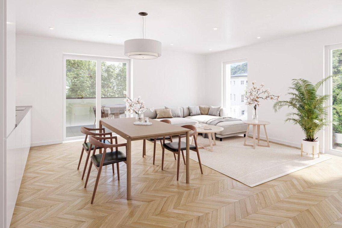 Qualität aus Leidenschaft: Im Inneren des Neubauprojekts steht hochwertiges Wohnen im Mittelpunkt: edle Materialien, zeitloses Design und eine durchdachte Ausstattung erzeugen ein behagliches Wohngefühl. Großformatige Glaselemente sorgen für viel Tageslicht und schaffen ein offenes Wohnambiente, während elegante Eichen-Massivholzböden für natürliche Wärme und Stil stehen. Die Nassbereiche sind mit exklusiven Marken-Armaturen von Hansgrohe sowie Villeroy & Boch sowie großflächigen Fliesen ausgestattet – ein klares Statement für moderne Architektur.