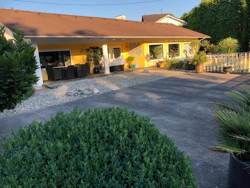 Von Nachbarn uneinsehbar, befinden sich auf einem 2200m2 großem Grundstück ein 140m2 großer Bungalow und ein 70m2 großes Gästehaus. Weitere Bauwerke sind eine unterkellerte, an der Straße gelegene Garage und eine 70m2 große Terasse unter der sich eine 70m2 Garage befindet. Eine 45m2 Garage mit 4m Raumhöhe gibt es auch.