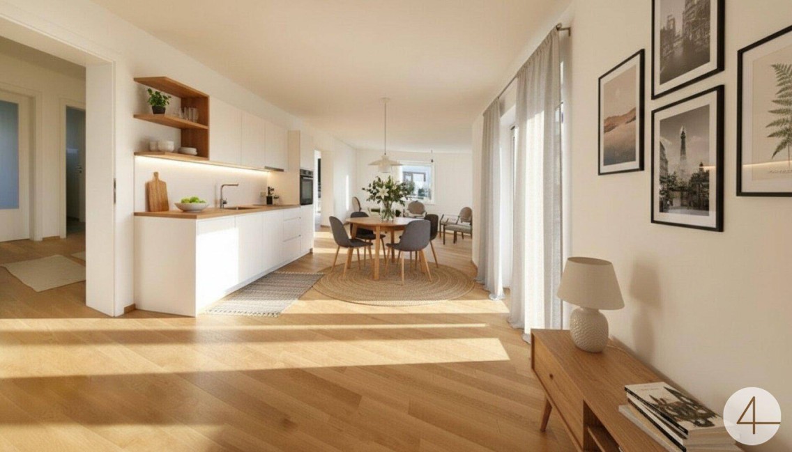 Einladendes Vorzimmer mit elegantem Garderobenbereich, weiter Flur, offener Wohn-Ess-Küchenbereich mit Zugang zur großzügigen 92 m² Terrasse.