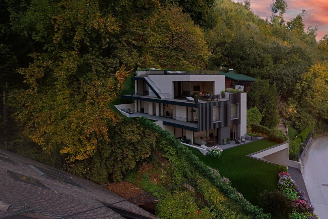 Klare Formen und natürliche Materialien harmonieren mit minimalistischer Architektur auf ganzer Linie. Die großzügigen Zimmer und offenen Wohnbereiche im oberen Teil des Hauses schaffen eine einzigartige Wohnatmosphäre, in der die umgebende Natur, das beeindruckende Panorama und die praktische Lage perfekt aufeinander abgestimmt sind.