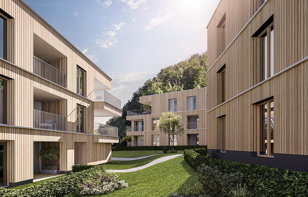 Die Fassade wird in heimischem Holz ausgeführt und sorgt für ein natürlich anmutendes Gesamtbild. Ergänzend dazu werden die Flachdächer der drei Wohnhäuser mit extensiver Begrünung gestaltet – dadurch ergibt sich neben einem kühlenden Effekt besonders in den Sommermonaten auch eine ökologisch wertvolle Nutzung der Dachfläche. Eine Photovoltaikanlage rundet das moderne, zukunftsfähige Wohnkonzept ab.