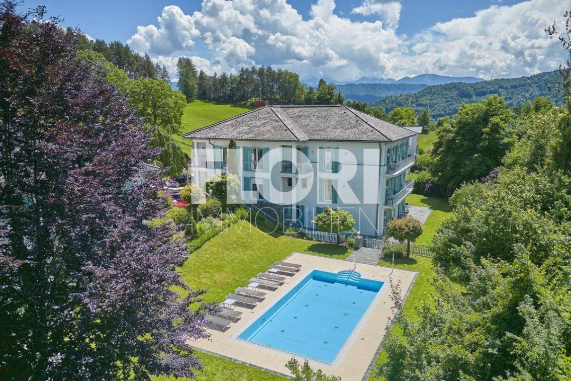 Die Liegenschaft, mit großartigem Blick auf den Wörthersee, liegt oberhalb der Pörtschacher Bucht.