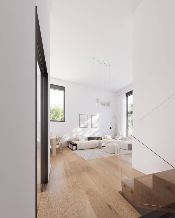 Durch die nahezu raumhohen Verglasungen entsteht ein fließender Übergang zwischen den Wohnbereichen und der Natur. Das Spiel mit Raum und Licht schafft eine einzigartige Wohnatmosphäre. Gezielt positionierte Terrassen und Loggien laden ein zum Verweilen und Bieten maximale Privatsphäre.