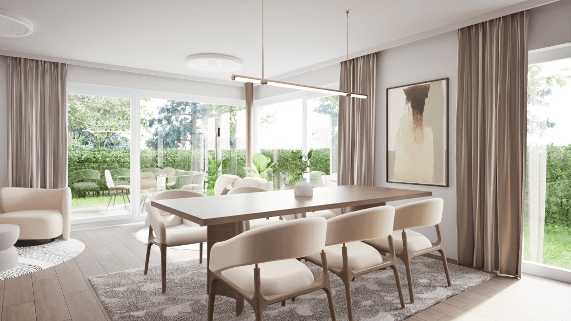 Jede Einheit überzeugt durch eine durchdachte Grundrissgestaltung auf drei Ebenen, großzügige Wohn- und Schlafbereiche, lichtdurchflutete Räume sowie ein Dachstudio mit weitläufiger Terrasse. Ergänzt wird das Raumangebot durch private Gärten, die Erholung und Rückzug im Grünen ermöglichen.