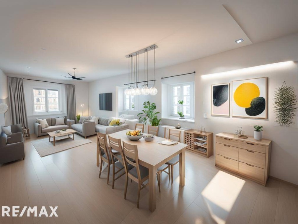 Ursprünglich war der Wohnbereich in zwei Räume aufgeteilt, wodurch die Wohnung insgesamt drei Zimmer hatte. Es besteht somit die Möglichkeit, diese Wand wieder einzuziehen, um den ursprünglichen Zustand mit drei separaten Zimmern wiederherzustellen. Dies bietet eine flexible Gestaltungsmöglichkeit, insbesondere für Familien oder für diejenigen, die ein zusätzliches Büro oder Gästezimmer benötigen.
