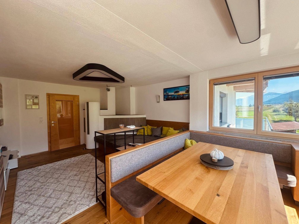 Die Küche mit Steinarbeitsplatte, Zusatzherd und Speis ist funktionaler Mittelpunkt. Das Hauptschlafzimmer mit Balkonzugang eröffnet ein beeindruckendes Bergpanorama, zwei weitere Zimmer sind flexibel nutzbar. Bad mit Eckwanne und Dusche rundet das Angebot ab.