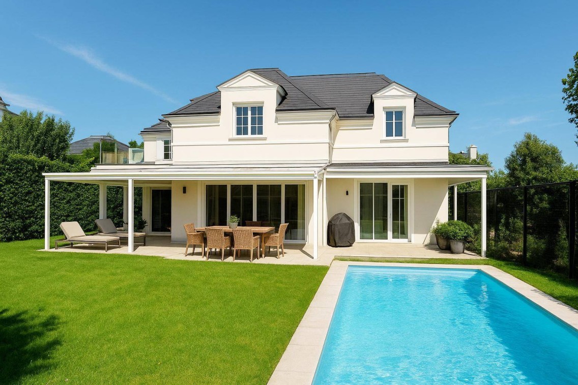 Das Erdgeschoss überzeugt mit einem offen gestalteten Wohn- und Essbereich, großzügigem Wintergarten und einer zusätzlichen Anrichteküche, perfekt für gesellige Anlässe. Der sonnige Südgarten präsentiert sich als ruhige Oase, ausgestattet mit Pool, Sichtschutz und vollautomatischem Bewässerungssystem.