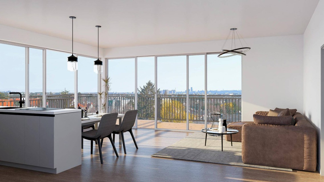 Wohnzimmer mit voller Glasfront und grandiosem Wienblick.