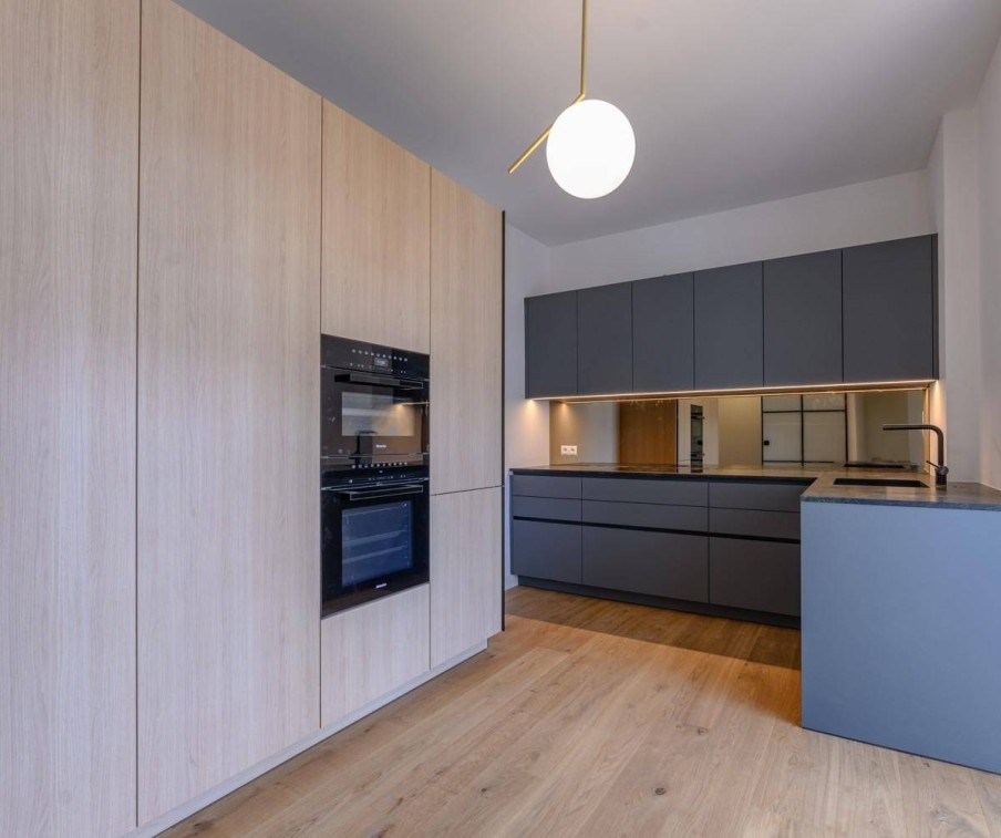 Westseitig finden Sie ein großes Schlafzimmer zum ruhigen Innenhof ausgerichtet und mit schönem Ausblick. Nebenan ist die modern und hochwertig ausgestattete Eggersmann Küche, die keine Wünsche offen lässt. Sie bietet auch noch genügend Platz für eine kleine Essecke. Von der Küche aus gelangt man auf die große Loggia, eines der Highlights dieser Wohnung.