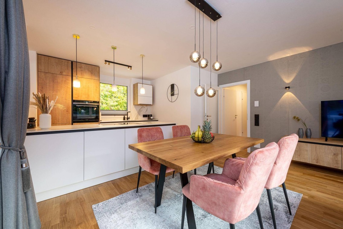 • Fix verbaute Einrichtung (hochwertige Küche, Garderobe, Kleiderschrank, TV-Regal etc.) ist im Kaufpreis inkludiert