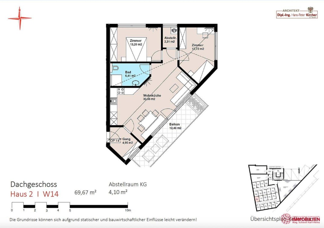 Wohnflächen zwischen ca. 40 und 70 m².Top 14 – 3-Zimmer-Wohnung mit BalkonDie Wohnung verfügt über eine Wohnfläche von 69,67 m² sowie einen Balkon mit 12,48 m².Wohnraum: 30,08 m²Schlafzimmer 1: 13,20 m²Schlafzimmer 2: 12,72 m²Bad: 6,41 m²Abstellraum: 2,31 m²Balkon: 12,48 m²Die Grundrisse können flexibel angepasst werden – Wohnungen können vergrößert oder verkleinert werden.