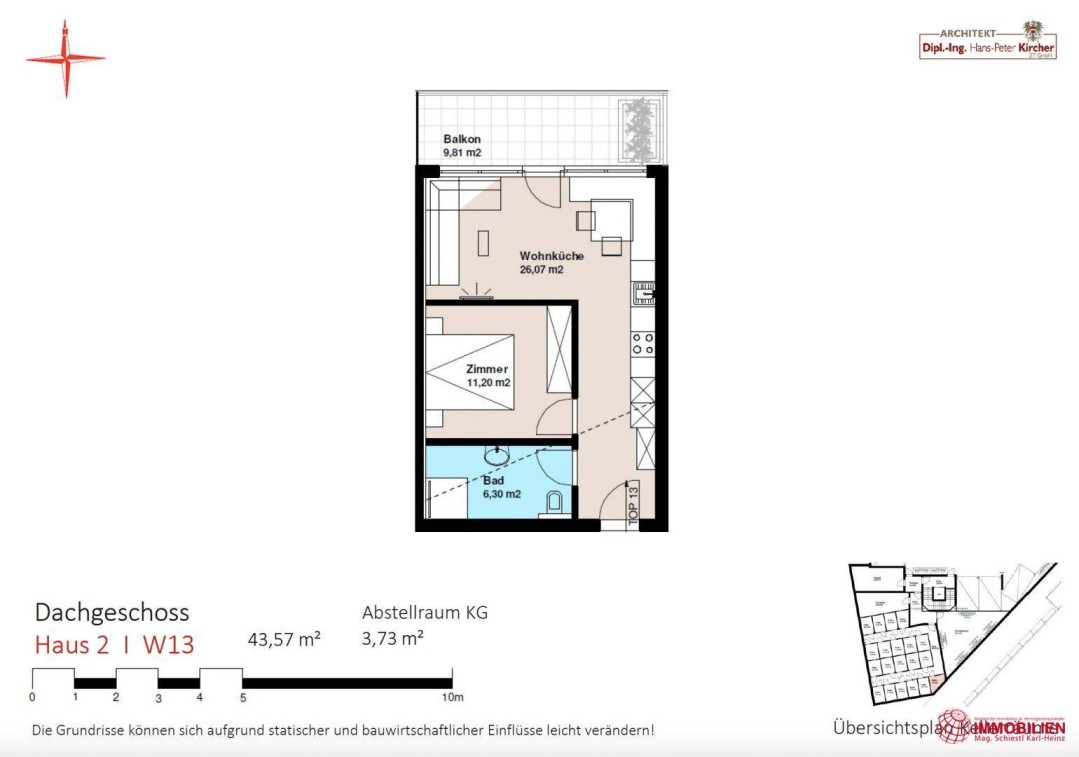 Wohnflächen zwischen ca. 40 und 70 m².Top 13 – 2-Zimmer-Wohnung mit BalkonDie Wohnung verfügt über eine Wohnfläche von 43,57 m² sowie einen Balkon mit 9,81 m².Wohnraum: 26,07 m²Schlafzimmer: 11,20 m²Bad: 6,30 m²Balkon: 9,81 m²Die Grundrisse können flexibel angepasst werden – Wohnungen können vergrößert oder verkleinert werden.