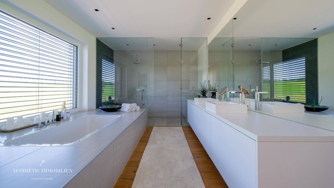 Im gesamten Haus wurden ausschließlich exquisite Materialien verwendet, darunter edle Parkettböden, die ein warmes und stilvolles Wohngefühl schaffen. Raffstores sorgen gemeinsam mit integrierten Insektenschutzsystemen für Komfort zu jeder Jahreszeit. Eine Fußbodenheizung in Kombination mit einer effizienten Luftwärmepumpe gewährleistet ein angenehmes Raumklima. Für zusätzliche Sicherheit sorgt eine hochwertige Alarmanlage. Die großzügige Doppelgarage sowie ein Technik- und Abstellraum runden das durchdachte Raumkonzept ab.