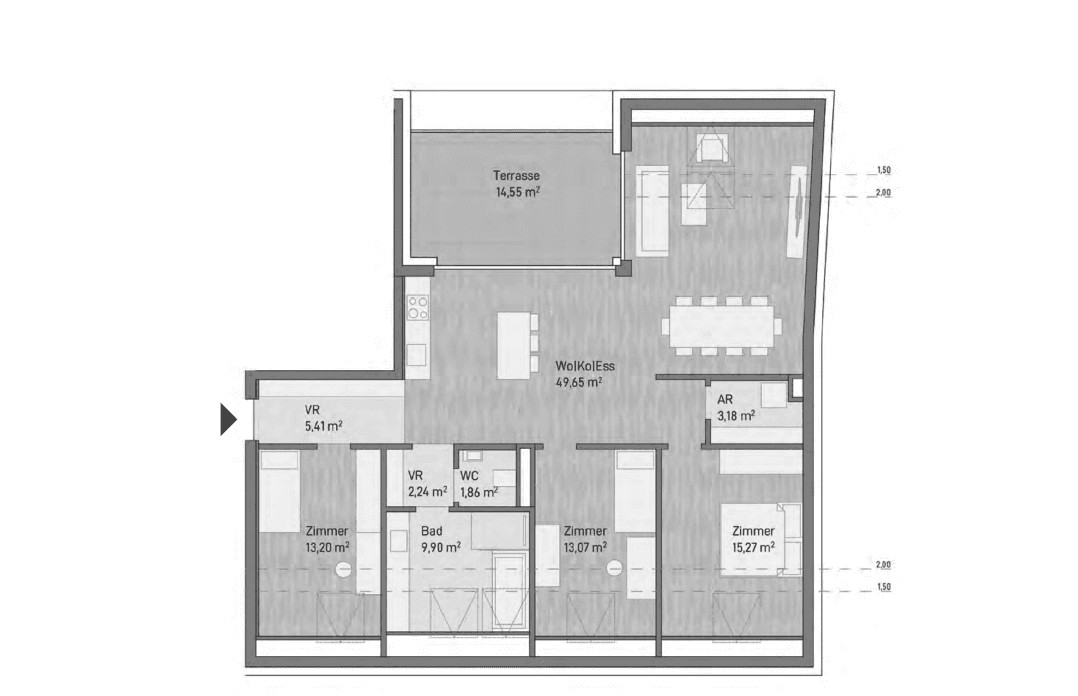 Die Wohnung bietet einen einladenden Vorraum, von dem aus alle Hauptbereiche zugänglich sind. Der offene Wohn-/Ess-/Küchenbereich bildet das Herzstück der Wohnung und öffnet sich direkt zur großzügigen Terrasse, die zum Verweilen im Freien einlädt.