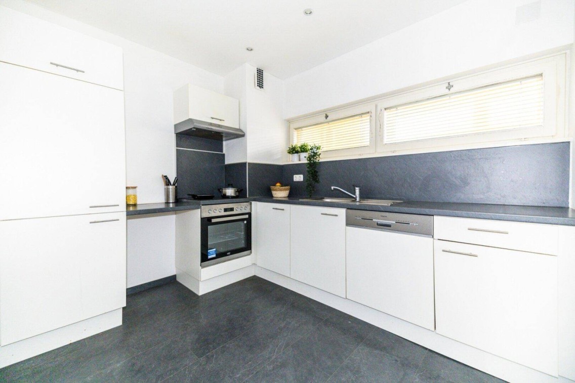 Die extra begehbare Küche ist funktional ausgestattet mit E-Herd, Ceranfeld, Kühlschrank mit Gefrierfach und Geschirrspüler. Moderne Spots sorgen für angenehmes Licht.Separates WC & praktischer Abstellraum