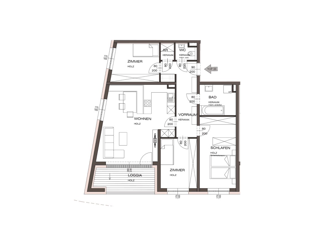 Die ca. 86 m² große 4-Zimmer-Wohnung C33 befindet sich im 2. Stock von Baukörper C und beinhaltet alle Elemente die eine große und moderne Eigentumswohnung haben muss. Ein großzügiger Vorraum, einen Abstellraum, 2 Schlafzimmer, ein Bad mit Badewanne, ein separates WC und eine offen gestalteten Wohnbereich. Das Highlight der Wohnung ist das großzügige Wohnzimmer mit Wohnküche, welches Platz für eine gemütliche Couch, TV-Board und einen großen Esstisch bietet. Anschließend befindet sich die Loggia mit partiellem Blick zum Traunstein.
