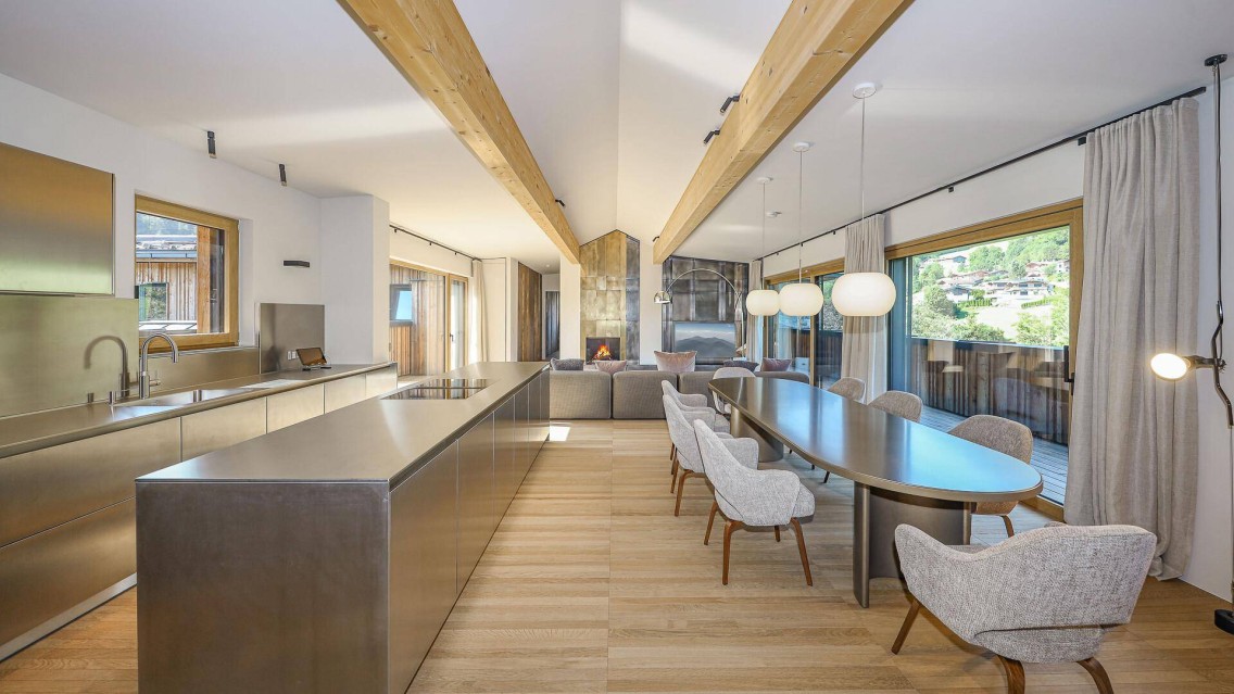 Vom Wohnbereich gelangt man auf zwei Balkon-Terrassen mit traumhaftem Ausblick auf den Rettenstein, das Kitzbüheler Horn und den Sonnberg.