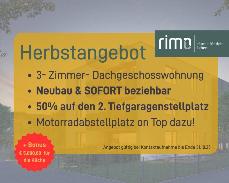 Zusätzlich stehen KFZ- und Motorrad-Abstellplätze in der Tiefgarage zur Verfügung (Basispreis KFZ-AP € 27.500,– lt. Sammelpreisliste, Motorrad-AP € 10.000,–).Aktionsvorteile bis Ende Oktober:2. Tiefgaragen-Abstellplatz -50 %€ 5000,– Küchenbonus1 Motorrad-Abstellplatz gratisEin einmaliges Angebot für eine sofort beziehbare Neubauwohnung – sichern Sie sich jetzt Ihre Traumwohnung mit attraktiven Zusatzvorteilen!Wir beraten Sie gerne und freuen uns auf Ihre Anfrage.Alle Angaben basieren auf den Informationen des Eigentümers. Änderungen und Irrtümer vorbehaltenNoch nichts gefunden? Wir informieren Sie über geeignete Immobilienangebote noch vor allen anderen.