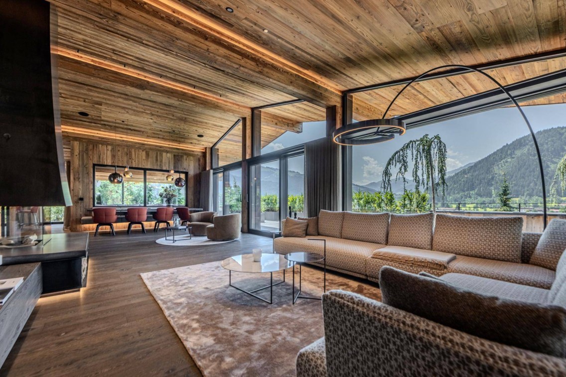Das Herzstück – die Wohnebene begeistert Sie mit edler Möblierung, einem Licht durchfluteten Ambiente durch raumhohe Fensterfronten und den direkten Zugängen auf die absolut fantastische und imposante Sonnenterrasse. Der Sichtdachstuhl in Altholz in Kombination mit dem sensationell in Szene gesetzten vierseitig offenem Kamin sowie dem gemütlichen Essbereich mit angrenzender, modern gestalteter Küche mit Back Kitchen bieten Wohnkomfort pur. Im darunter liegenden Geschoss erwarten sie neben dem Hightech Kino und der edlen Weinlounge auch vier moderne Schlafzimmer mit Bädern en suite. Großzügige Balkone sowie ein unbeschreiblich schöner Ausblick auf das Schloss Münichau komplettieren diese Etage. Im zweiten Untergeschoss, das aufgrund der Hanglage vollständig mit natürlichem Tageslicht versorgt wird, befindet sich der imposante Wellnessbereich mit einem 10 Meter langen Edelstahl – Indoor Pool samt Hydrostar-Schwimmturbine, dem Spa Bereich mit Sauna und Ruhezone, welcher zum ausgiebigen Entspannen einlädt. Das bestens ausgestattete und auch von außen begehbare Gäste Apartment mit eigener Sonnenterrasse runden dieses Geschoss ab.