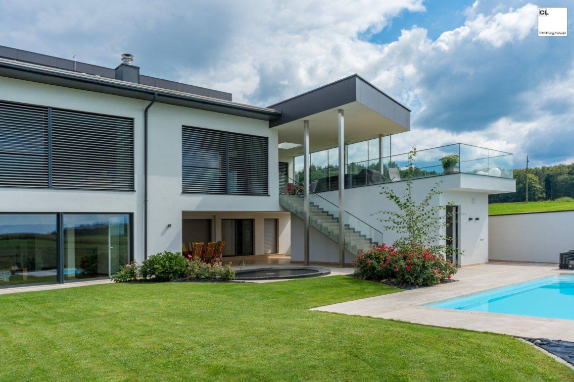Leben, Arbeiten und Genießen – alles unter einem DachIm Jahr 2017 wurde dieses Anwesen bis ins kleinste Detail neu konzipiert und in ein wahres Wohnjuwel verwandelt – ein architektonisches Meisterstück, das Design, Komfort und Funktionalität auf höchstem Niveau vereint.Genießen Sie absolute Privatsphäre – eingebettet in eine idyllische Umgebung aus Wiesen, Feldern und Wäldern. Großzügige Terrassenbereiche beim Wohn- und Essbereich sowie am Pool schaffen fließende Übergänge zwischen innen und außen und unterstreichen das unvergleichliche Lebensgefühl dieser außergewöhnlichen Villa.Schon beim Betreten beeindruckt das großzügige Entrée und führt in den elegant gestalteten Wohn- und Essbereich. Mehrere stilvolle Aufenthaltszonen mit Kaminfeuer, der gemauerte Pizza-Backofen und der freie Blick ins Grüne schaffen ein Ambiente, das Wärme und Großzügigkeit perfekt verbindet.Der Master Bedroom ist ein Refugium für sich – mit großem Bad en suite, freistehender Wanne, weitläufigen Schranklösungen, einer Sauna mit Infrarot-Funktion, Ruhebereich und einem separaten Fitnessraum.Die Design-Küche überzeugt mit durchdachter Architektur und edler Ausstattung: großzügige Anrichteflächen, exklusive Geräte, ein verstecktes Kühlhaus und mehrere raumhohe Kühlschränke machen sie zum kulinarischen Herzstück des Hauses.Im Obergeschoss erwarten Sie drei weitere Schlaf- bzw. Kinderzimmer, ein Home-Office und ein zusätzliches Badezimmer – perfekt für Familie, Gäste oder Rückzugsbereiche.Im vollunterkellerten Untergeschoss verbirgt sich ein weiteres Highlight: eine eigene, komplett ausgestattete Einheit mit Küche – ideal für Personal, Gäste oder geschäftliche Nutzung.Besonders hervorzuheben: