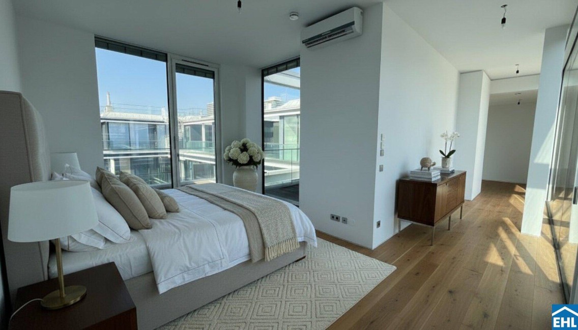 Luxuspenthouse im renomierten "The Ambassy – Parkside Living"Exklusives Wohnen im prestigeträchtigen Botschaftsviertel WiensHighlights auf einen Blick:Toplage im 3. Bezirk – direkt im Botschaftsviertel, nahe Ringstraße & 1. BezirkGroßer Wohnraum mit etwa 70m², 3 Schlafzimmer mit 3 Bäder, alles auf einer EbeneBeeindruckende ca. 269 m² Terrassenfläche Exklusive Architektur, vollverglaste Fassade, ohne DachschrägenErstbezug, Belagsfertig ausgeführt – für individuelle Gestaltung nach Ihren Wünschen.Mit ca. 185 m² Wohnfläche auf einer Ebene und rund 269 m² beeindruckender Freiflächen, darunter großzügige Terrassenflächen mit hochwertiger Holz- bzw. Thermoesche-Belag, eröffnet dieses Penthouse neue Perspektive. Die klare, offene Grundrissgestaltung, eine Raumhöhe von bis zu 3 Metern und die raumhohe 3-fach Panoramaverglasung sorgen für eine lichtdurchflutete Wohnatmosphäre mit faszinierenden Blickachsen, vom Kahlenberg bis zum Stephansdom.Dank modernster Gebäudetechnik genießen Sie ganzjährig angenehmes Raumklima: Fußbodenheizung und Deckenkühlung in Kombination mit einem innovativen Fassadenlüftungssystem gewährleisten behaglichen Wohnkomfort auf technisch höchstem Niveau.Haus-Services & Infrastruktur