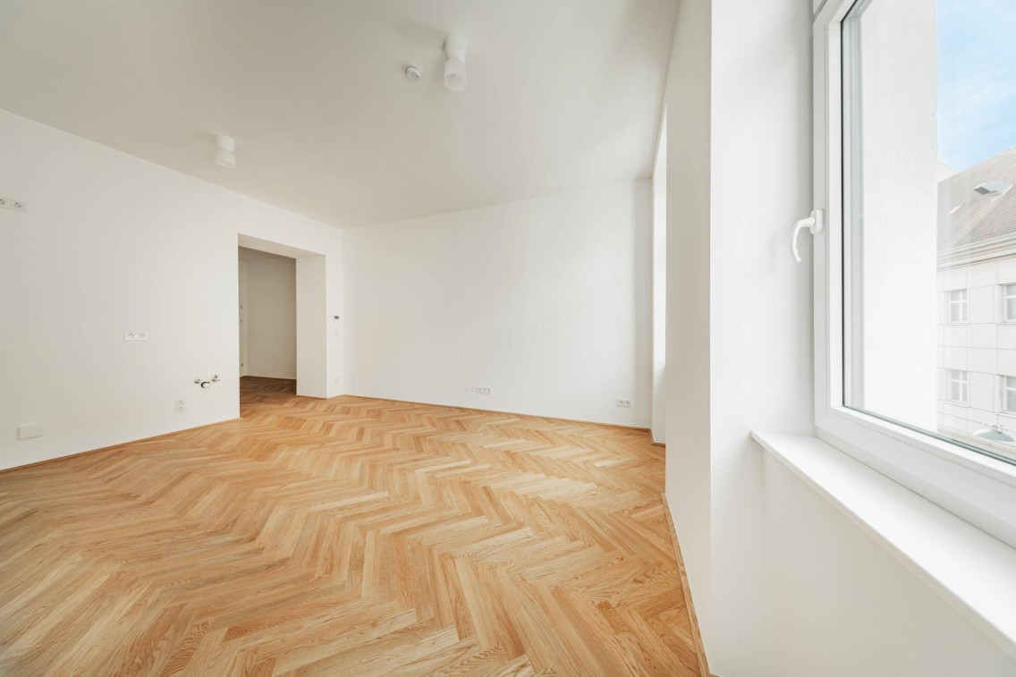 Diese wunderschön sanierte Zwei-Zimmer-Altbauwohnung im 2. Obergeschoss begeistert durch ihren zentral begehbaren Grundriss auf rund 45 m² Wohnfläche. Über den einladenden Vorraum gelangt man in die lichtdurchflutete, straßenseitige Wohnküche, das ruhige, hofseitige Schlafzimmer mit elegantem en suite-Bad samt moderner Walk-In-Dusche sowie in das separate WC.