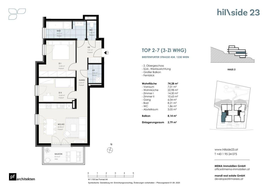 Bus: 253, 259 – Wien Rodaunbrücke (Breitenfurter Straße) (4 Gehminuten)Die 74,28 m²-Wohnfläche bietet wie folgt: