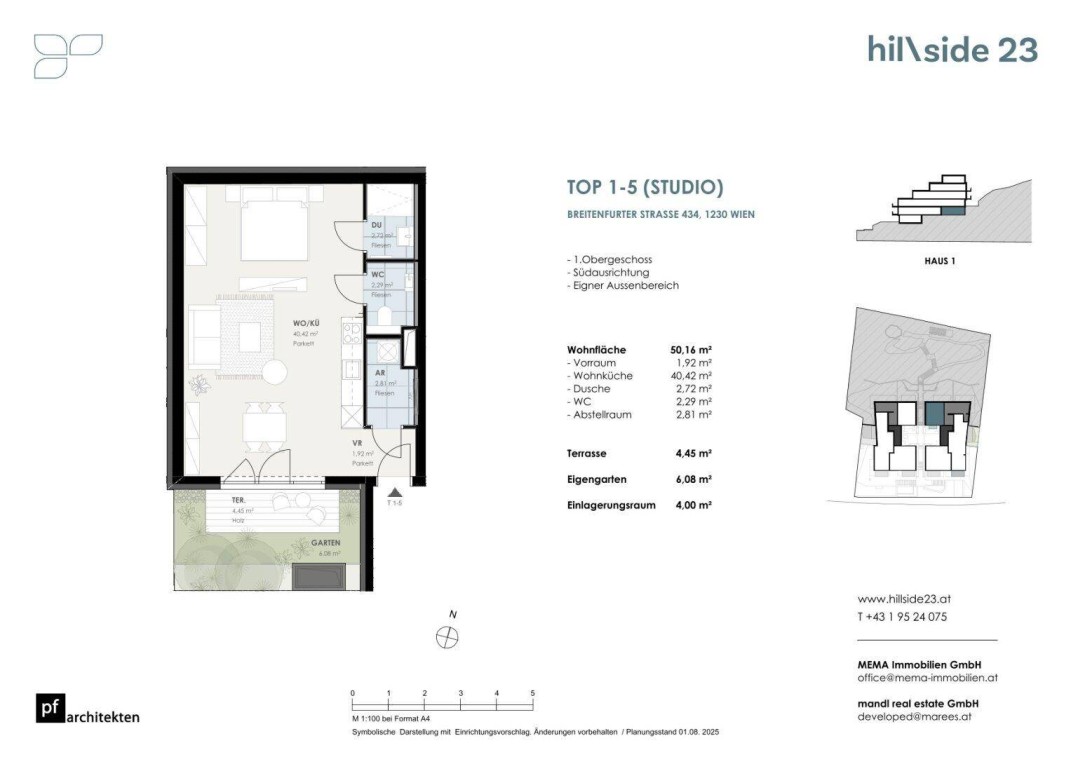 Zum Verkauf steht eine ca. 50 m² große 1-Zimmer-Gartenwohnung in einem Ende 2027 fertig werdenden Neubau. Die Wohnung befindet sich im 1. Obergeschoss. Die Wohnung blickt in die Breitenfurter Strasse Richtung Süden.Zwischen den Maurer Weinbergen und dem Liesinger Bach entsteht dieses traumhafte Wohnprojekt mit zwei Wohnhäusern. In der Anlage gelangen insgesamt 28 freifinanzierte Eigentumswohnungen, die 1 bis 5 Zimmer und Wohnflächen von 50 bis 145 m² bieten. Zu allen Wohnungen gehört entweder ein Balkon, eine Terrasse oder sogar ein Eigengarten. In der hauseigenen Tiefgarage stehen 21 Kfz-Stellplätze – davon 8 Komfortdoppelparker – zur Verfügung.Die Kombination aus praktischer Fußbodenheizung und -kühlung sowie Markenparkettböden (Eiche) bietet optimalen Komfort und ein angenehmes Wohngefühl. Die teilweise bodentiefen Holz-Alu-Fenster sind sowohl mit 3-fach-Isolierverglasung als auch mit außenliegenden Alu-Raffstores ausgestattet.Die Nassräume sind mit großformatigen Fliesen oder Feinsteinzeug versehen. Die Badezimmer verfügen über Duschen oder Badewannen sowie einen Waschmaschinenanschluss. In den Dachgeschosswohnungen werden Split-Klimaanlagen installiert.Die Beheizung und Warmwasseraufbereitung erfolgt mittels energieeffizienter mittels Luft-Wärmepumpe und wird durch eine Photovoltaikanlage unterstützt. Zu jeder Wohnung ist ein eigenes Kellerabteil zugehörig. Die Küche ist im Kaufpreis nicht enthalten.Den Bewohnern steht eine großzügige Gartenanlage als Ruheoase und Raum für gemeinsame Aktivitäten zur Verfügung.Alle wichtigen Einrichtungen und Geschäfte des täglichen Bedarfs sind nur wenige Gehminuten entfernt. Über den Gartenausgang in die Arabellagasse erreichen Sie das Einkaufszentrum Riverside und das Zentrum von Mauer in kurzer Zeit. Die grüne Umgebung bietet eine einzigartige Kombination aus Natur und urbanem Komfort.Infrastruktur: