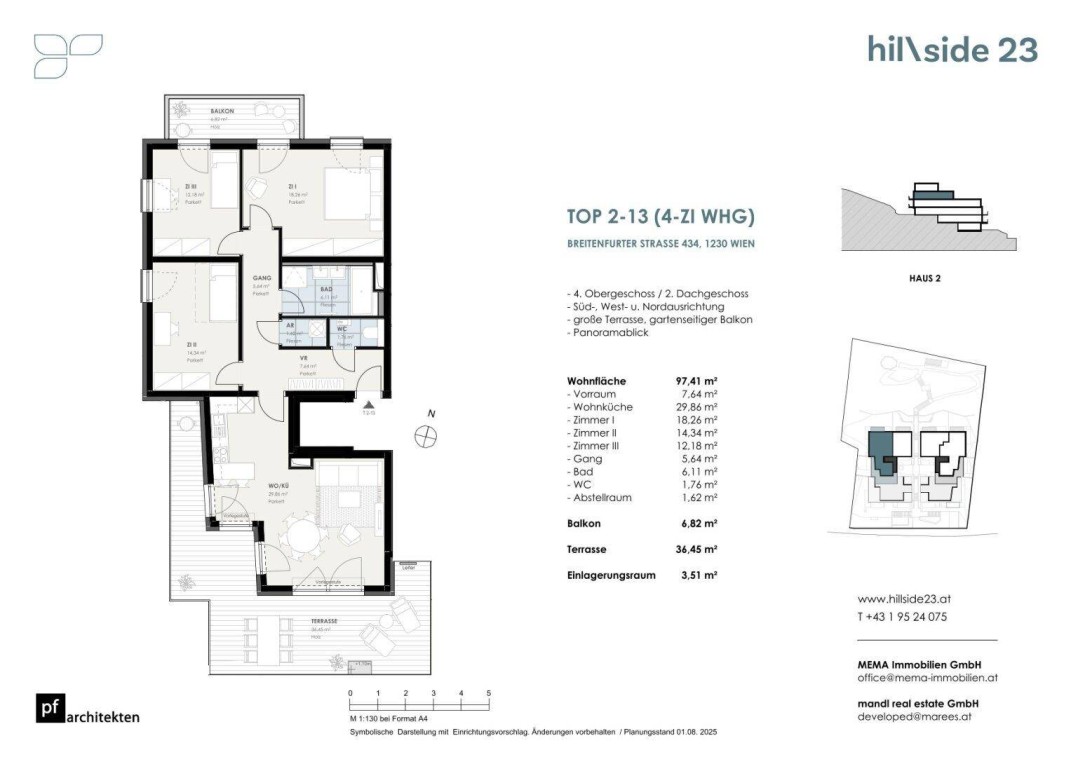 Zum Verkauf steht eine ca. 97 m² große 4-Zimmer-Dachgeschosswohnung in einem Ende 2027 fertig werdenden Neubau. Die Wohnung befindet sich im 4. Obergeschoss/2. Dachgeschoss. Die Wohnung blickt in den Erlebnisgarten Richtung Norden und in die Breitenfurter Strasse Südosten.Zwischen den Maurer Weinbergen und dem Liesinger Bach entsteht dieses traumhafte Wohnprojekt mit zwei Wohnhäusern. In der Anlage gelangen insgesamt 28 freifinanzierte Eigentumswohnungen, die 1 bis 5 Zimmer und Wohnflächen von 50 bis 145 m² bieten. Zu allen Wohnungen gehört entweder ein Balkon, eine Terrasse oder sogar ein Eigengarten. In der hauseigenen Tiefgarage stehen 21 Kfz-Stellplätze – davon 8 Komfortdoppelparker – zur Verfügung.Die Kombination aus praktischer Fußbodenheizung und -kühlung sowie Markenparkettböden (Eiche) bietet optimalen Komfort und ein angenehmes Wohngefühl. Die teilweise bodentiefen Holz-Alu-Fenster sind sowohl mit 3-fach-Isolierverglasung als auch mit außenliegenden Alu-Raffstores ausgestattet.Die Nassräume sind mit großformatigen Fliesen oder Feinsteinzeug versehen. Die Badezimmer verfügen über Duschen oder Badewannen sowie einen Waschmaschinenanschluss. In den Dachgeschosswohnungen werden Split-Klimaanlagen installiert.Die Beheizung und Warmwasseraufbereitung erfolgt mittels energieeffizienter mittels Luft-Wärmepumpe und wird durch eine Photovoltaikanlage unterstützt. Zu jeder Wohnung ist ein eigenes Kellerabteil zugehörig. Die Küche ist im Kaufpreis nicht enthalten.Den Bewohnern steht eine großzügige Gartenanlage als Ruheoase und Raum für gemeinsame Aktivitäten zur Verfügung.Alle wichtigen Einrichtungen und Geschäfte des täglichen Bedarfs sind nur wenige Gehminuten entfernt. Über den Gartenausgang in die Arabellagasse erreichen Sie das Einkaufszentrum Riverside und das Zentrum von Mauer in kurzer Zeit. Die grüne Umgebung bietet eine einzigartige Kombination aus Natur und urbanem Komfort.Infrastruktur: