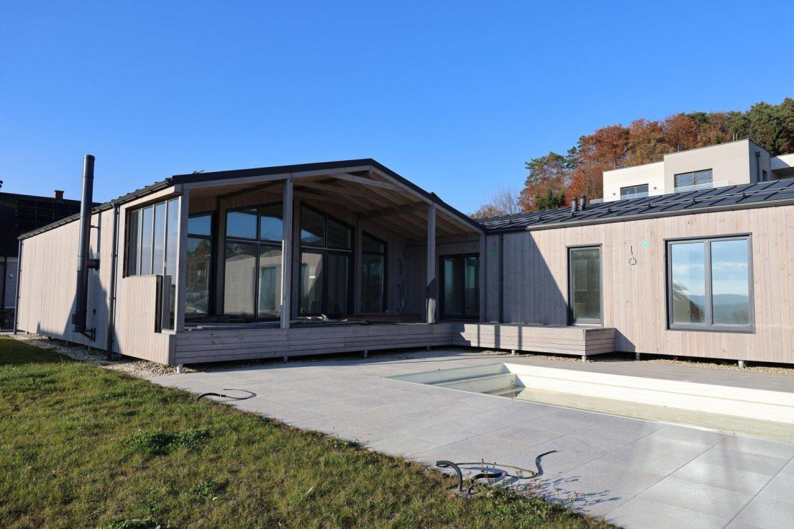Das moderne Holzriegelhaus besteht aus 2 kombinierten Modulhäusern, diese wurden in ökologische Bauweise mit zeitloser Architektur und einem lichtdurchfluteten Wohnkonzept errichtet. Großflächige Fensterfronten bieten einen traumhaften Ausblick in die Natur und schaffen ein angenehmes, gesundes Raumklima – perfekt für Menschen, die Wert auf Umweltbewusstsein und Wohnqualität legen.Raumaufteilung:Großzügiger Eingangsbereich mit Diele und Garderobe offener Bereich für KücheEssen und Wohnen mit Zugang zur TerrasseSpeisWirtschaftsraumBadezimmer mit Doppelwaschbeckenvorrichtung, Walk in Dusche WCBadezimmer mit Badewanne, Vorrichtung für ein Waschbecken, WC und Zugang auf die Terrasse2x Schlafzimmer mit flexiblen Bereich für Schrankraum oder Arbeitszimmer...weiteres Zimmer mit Terrassenzugang Technikraum Ausstattung und MaterialienHochwertige, umweltfreundliche Materialien mit Fokus auf LanglebigkeitHolz-Alu-Fenster mit IsolierverglasungHochwertige Böden Kaminanschluss im WohnbereichTerrasse mit schönem Ausblick ins GrüneSchwimmbad vorhandenKlimaanlage vorbereitetAußenliegender Sonnenschutz (Shutter) vorbereitetDas Wohnhaus ist noch nicht zur Gänze fertiggestellt.