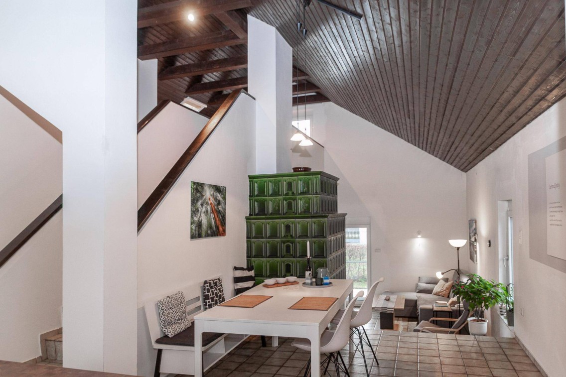 Vom Eingangsbereich gelangt man über einige Stufen in den Wohnbereich. Hier befinden sich das Wohnzimmer mit Ausgang auf die überdachte Terrasse und in den Garten, ein Schlafzimmer, ein Badezimmer mit Dusche sowie ein separates WC mit Waschtisch. Über ein paar weitere Stufen erreicht man den Küchen- und Essbereich, der sich gemütlich an einen traditionellen Kachelofen anschließt.