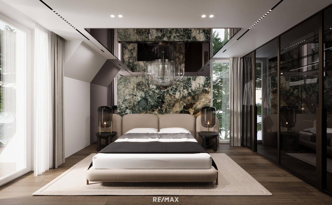 Das 2. Obergeschoß bildet den exklusiven Elternbereich – ein elegantes Schlafzimmer mit Ankleide, Bad en suite und direktem Zugang zur Dachterrasse. Von hier genießt man einen herrlichen Ausblick über die Baumkronen Hietzings und den Sonnenaufgang über Wien..