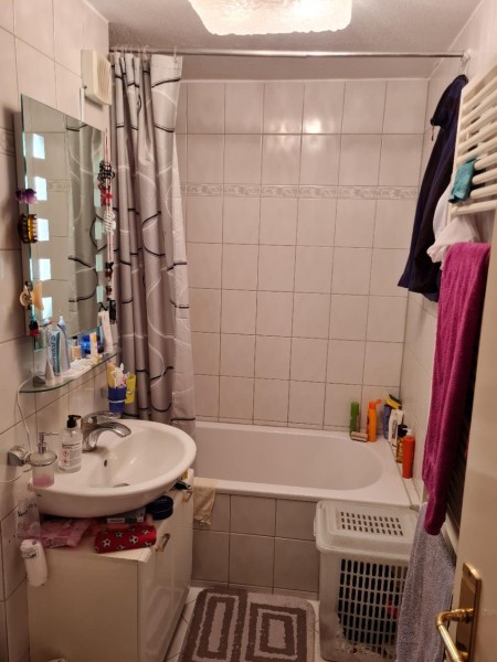 Das Badezimmer ist mit modernen Fliesen gefliest. Es iat komplett ein Laminat/Parkettboder verlegt. Der Gang die Küche sowie das Bad sind mit Fliesen versehen.