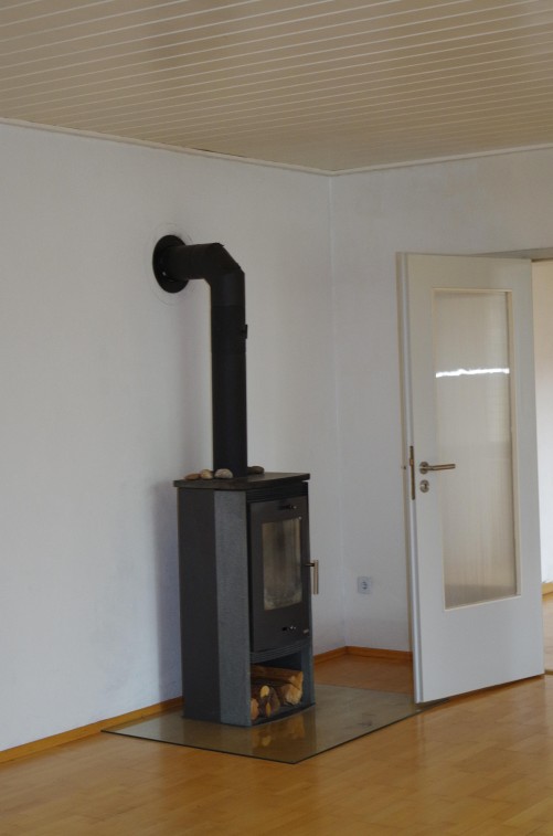 Der Grundriss ist gliedert in zwei Flügel mit mittig liegender zentraler Diele und Küche . In dem einen Flügel befinden sich Wohn- und Arbeitszimmer. Im Wohnzimmer garantiert eine breite Fensterfront (Südseite) Tageslicht, während ein Kaminofen im Winter für angenehme Wärme sorgt.