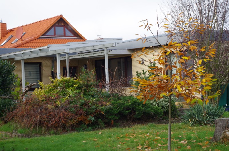 Zum Verkauf steht ein schöner L-förmiger Winkelbungalow in Braunschweig mit überdachter Terrasse.