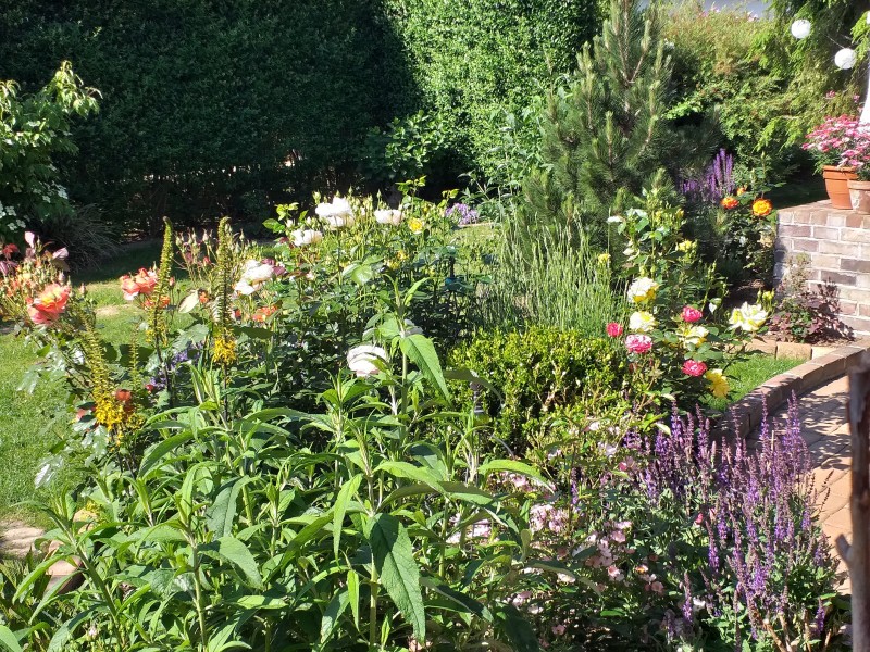 Garten ist sehr gepflegt, Blumen, Rasen, Sträucher (Hortensien, Rosenbeete, Flieder, Lavendel, ...).